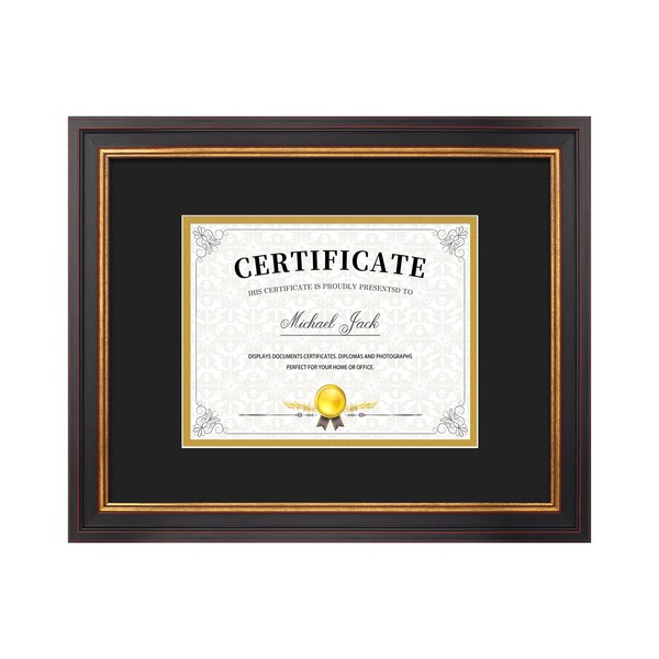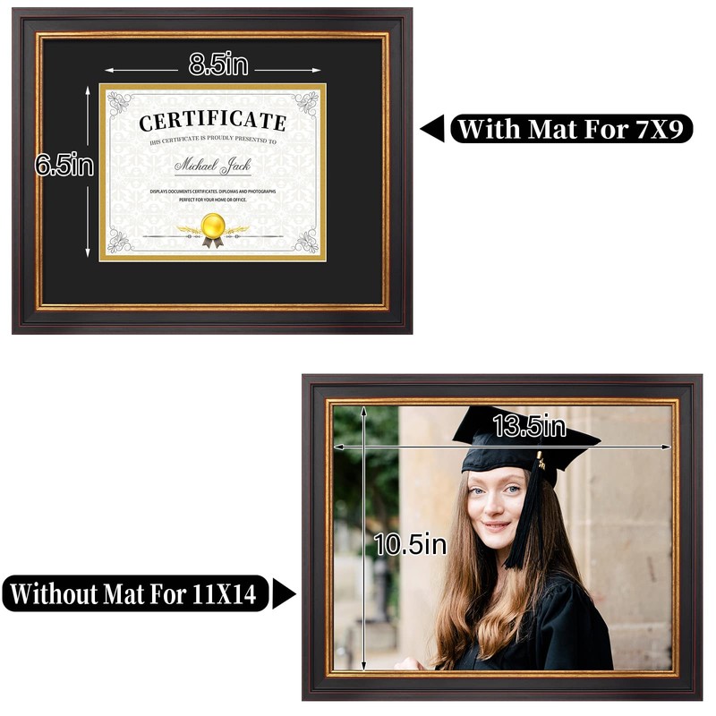 Frametory, 7x9 Diploma Frame with (Black/Gold) Double Mat or 11x14 Without Mat, Black Gold & Burgundy, Sawtooth Hangers, Wall Display for Pictures/Certificates/Documents, Real Glass