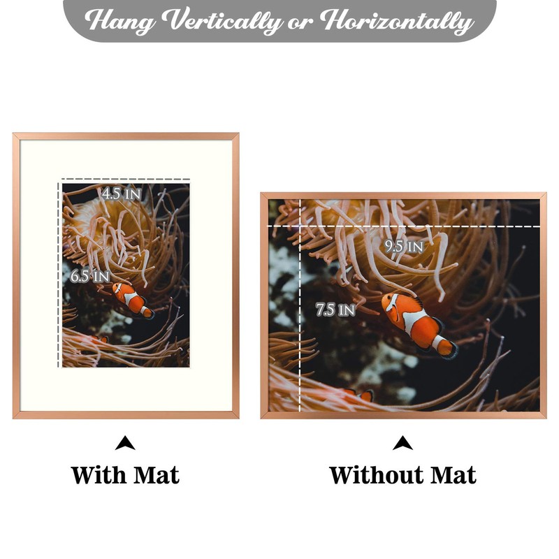 - Modern Design: Rose Gold color, includes a mat for 5x7 (display area: 4.5x6.5) picture or without mat for 8x10 picture (display area: 7.5x9.5)