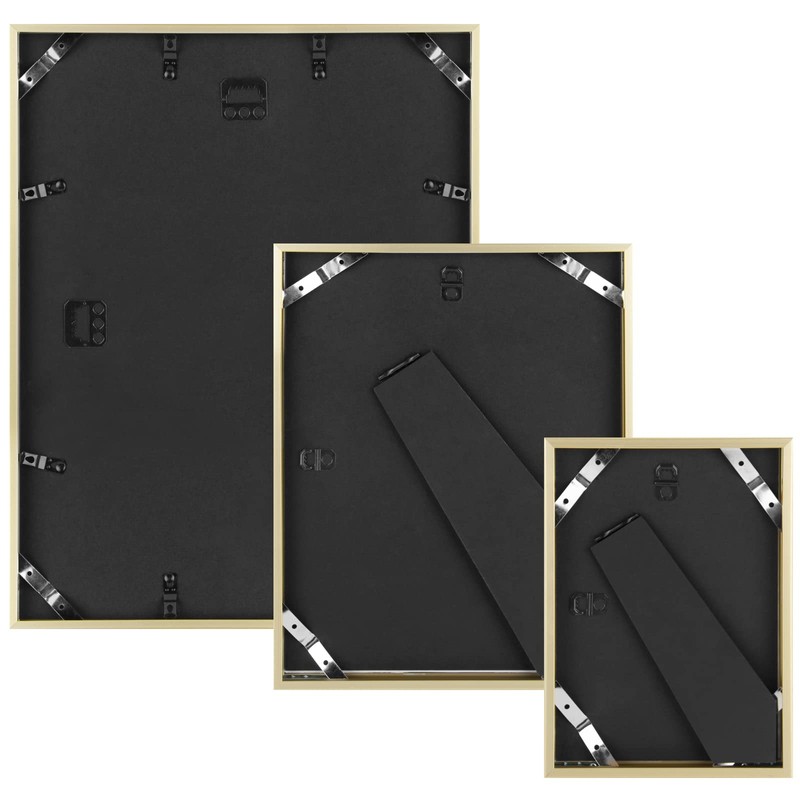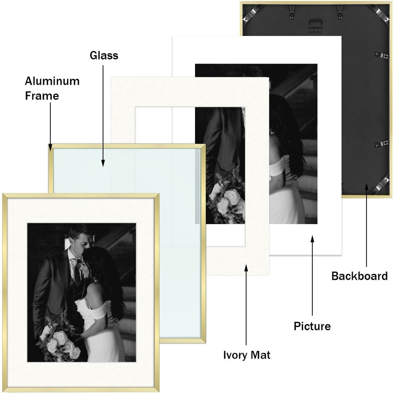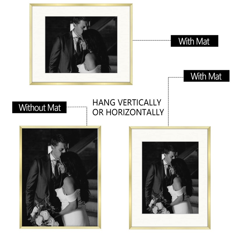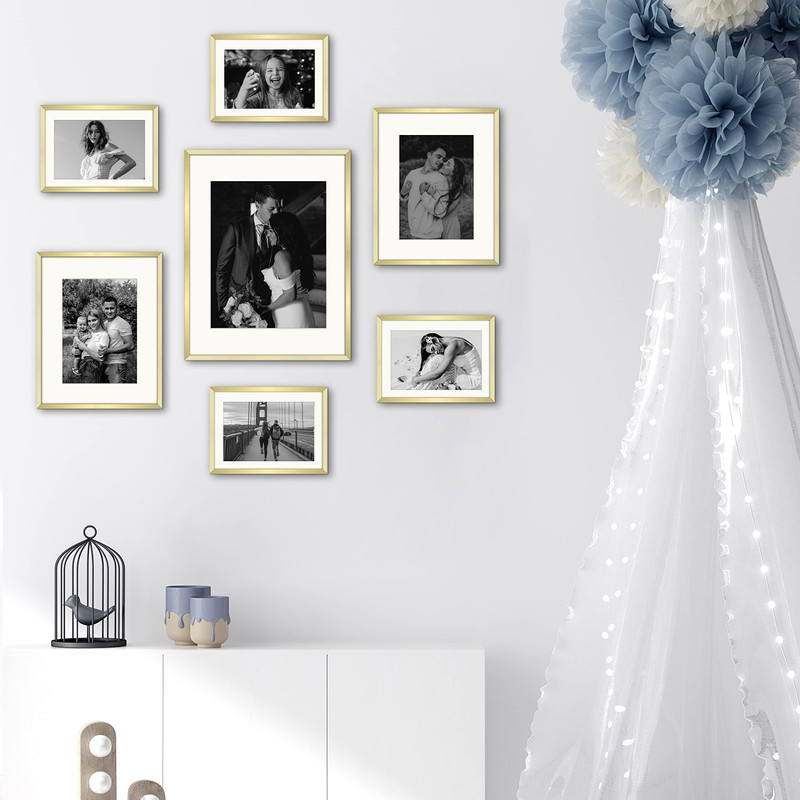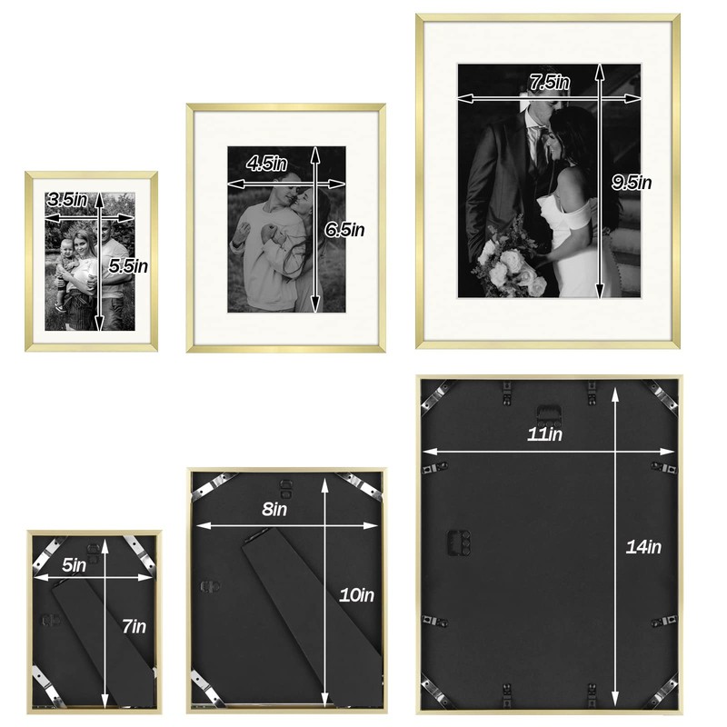 - Set of 7 Gold Metal Frames: Four 5x7-inch (Mat for 4x6 Photo), Two 8x10-inch (Mat for 5x7 Photo), and One 11x14-inch (Mat for 8x10 Photo)