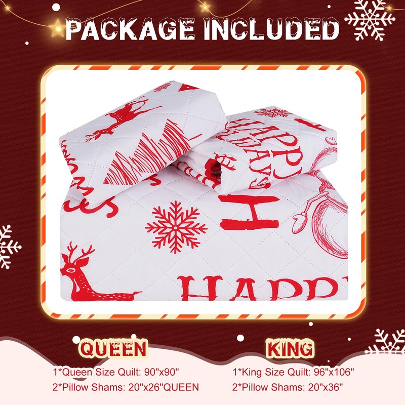 - Package Includes: 3-piece king quilt bedding set contains 1 quilt and 2 pillow shams. Quilt size: 229*229cm(90"*90"), pillow sham size: 51*66cm(20"*26"). Queen size bedspread quilt are suitable for all seasons, offering enough warm and making sure you enjoy a good night's sleep. The Christmas quilt set can also be used as a bed sheet to decorate your bed and provide you with comfort.