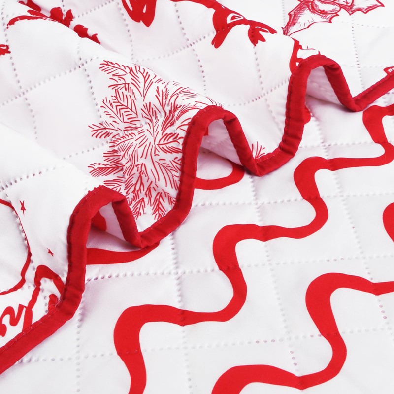 - Reversible Design: The reversible Christmas quilt sets adopt digital printing technology, matching clear patterns and bright colors. The front side features bright holiday elements, including kind of Christmas trees, reindeers, snowman, snowflakes, "HAPPY HOLIDAYS", etc..The back is patterned with red wavy stripes.These red Christmas elements add vitality and a relaxed atmosphere to your bedroom.