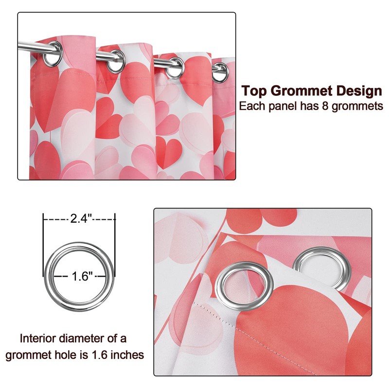 - SIZE DESIGN: 2 panels per package. Each panel is 52" wide x 63" long and has 8 stainless steel silver grommets, each with an inner diameter of 1.6 inches. The heart pattern curtains are designed with a special looping process, which makes it easier and more convenient to install and slide.