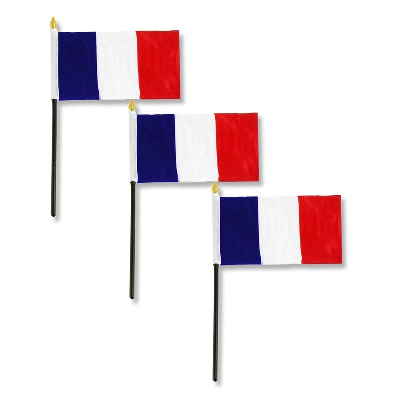 This France stick flag is 4" x 6" and comes mounted on a 10" plastic stick. It is made from polyester, sewn around the edges and printed in bright colors to make an attractive flag. This flag size is great for display on shelves, desktops and counters. Available quantity of 1, 3, or 12