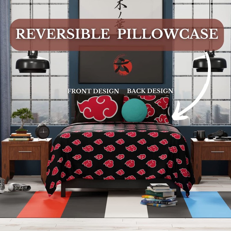 • NARUTO DESIGN: Bring the fun and adventure of the anime Naruto home with this "Cloud Cluster" themed sheet set featuring Naruto's classic cloud symbol in red on a black background.