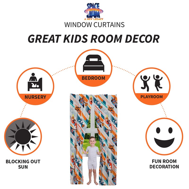 - SPACE JAM 2 Un nuevo diseño de legado: añade un poco de estilo de golpe al mundo de tu hijo con estas coloridas cortinas Space Jam 2. Con LeBron James, Tweety, Bugs Bunny, Daffy Duck, Taz y Sylvester de la popular secuela animada de WB, estas cortinas aparecen con un patrón deportivo "Basket Hanging".