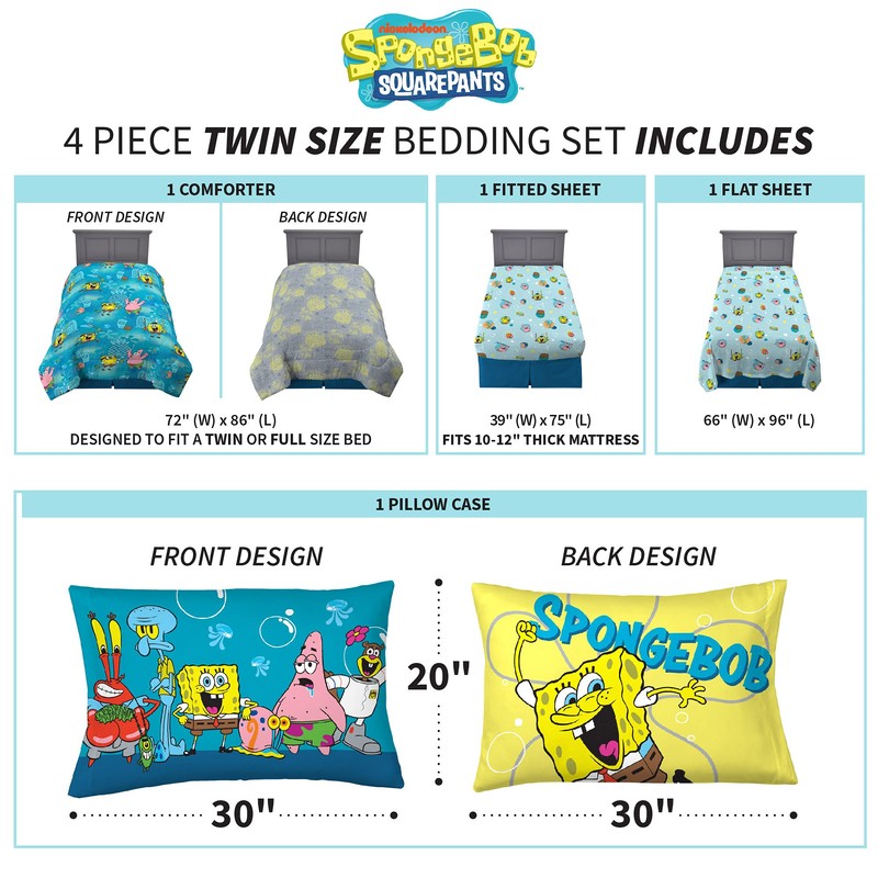 - TWO DESIGNS IN ONE COMFORTER: Change up the action and flip over the reversible comforter for a new look into the world of SpongeBob. One side features the zany blue underwater world of SpongeBob and Patrick while the other showcases SpongeBob's pineapple home in a more neutral grey and yellow color. Both options offer a fun choice for your child's room.
