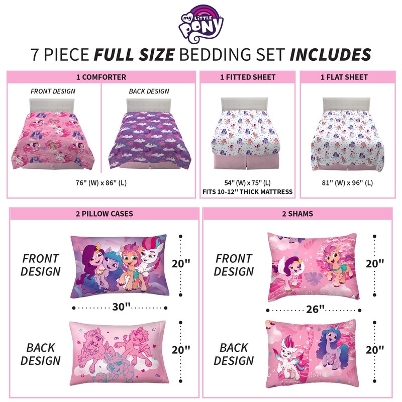 - MY LITTLE PONY DESIGN: Bring the friendly fun and adventures of My Little Pony home with this cute and colorful bedding bundle. Featuring pony pals Sunny, Izzy, Zipp Storm and Pipp Petals, the "Friendship & Ponies" pattern captures the positive vibes of the popular Hasbro franchise.