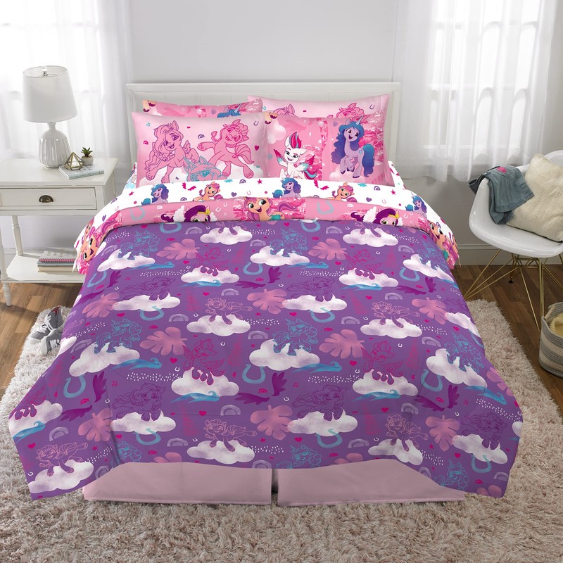 - TWO DESIGNS IN ONE COMFORTER: There’s no need to settle for one cute My Little Pony look with this fun reversible comforter. On one side, ponies Sunny, Izzy, Zipp Storm and Pipp Petals frolic against a pretty pink backdrop. When it’s time for a new adventure, simply flip the comforter over to reveal a silhouette high-flying print of Zipp Storm and Pipp Petals against a vibrant purple background.