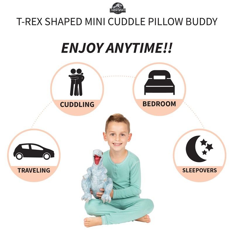 - ITEM INCLUDES: The Jurassic T-Rex Dinosaur character shaped plush mini cuddle pillow buddy measures approximately 20" x 8.5" x 4". The perfect size to snuggle while sleeping or as a stuffed animal for toddler and children play time.