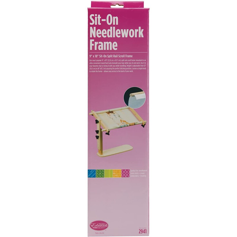 Our sit-on or "fanny frame" allows you to work comfortably while relaxing in your favorite chair. This uniquely designed frame is portable enough to use while traveling, and comes with a 9" x 18" split rail scroll frame. This frame will hold your fabric taut and wrinkle free while allowing you the use of both hands in order for you to complete your work.