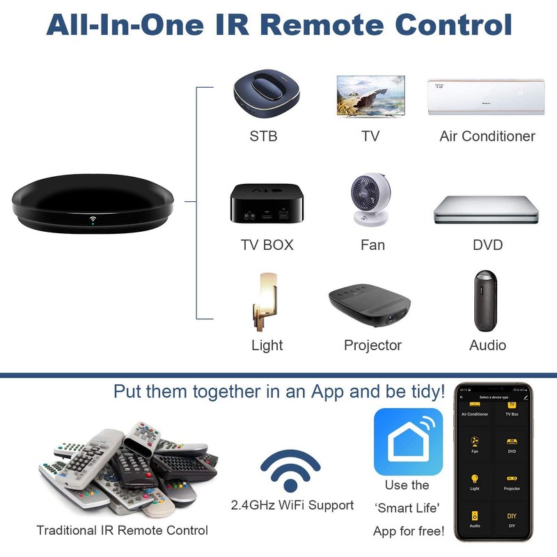- 🔊Easy to Install and Connect——Download the Smart Life or Tuya application, add devices, press and hold the reset button for a few seconds, until the network configuration indicator flashes, search for devices manually or automatically, connect to WiFi (2.4G Hz only),You can add and use devices.NOTE: It is a remote control (38K kHz) for IR equipment, not a remote control for RF control.