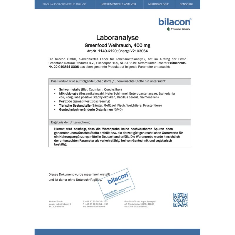 Frankincense contains a complex of essential oils, resin, tannins and boswellia acids. Greenfood Boswellia contains 65% boswellic acids.