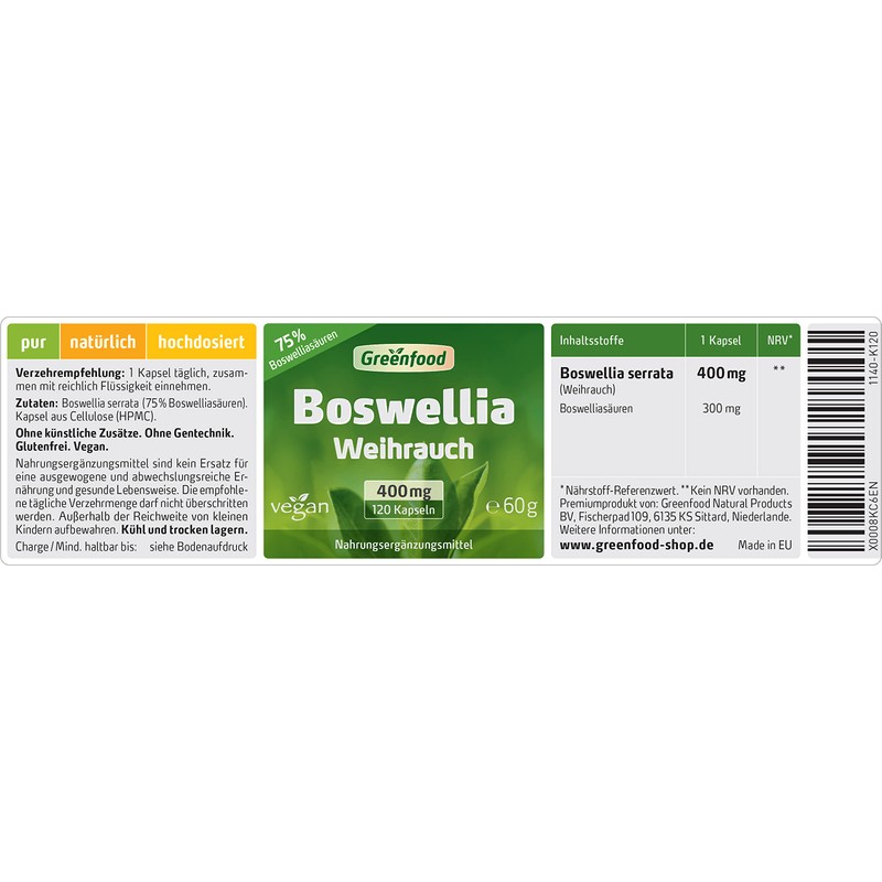 1 capsule = 400 mg incense (Boswellia Serrata).