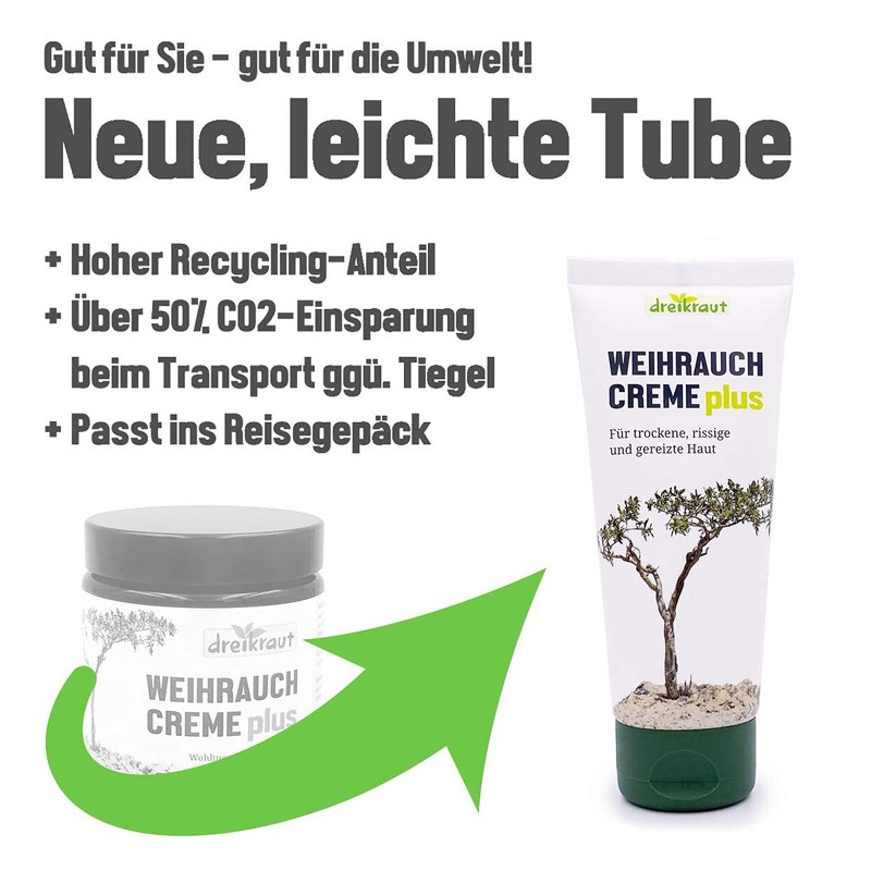 Frankincense cream plus from Dreikraut is a benefit: with its valuable incense oil and high-quality plant extracts, it supports the physical well-being with various ailments. The Boswellia Carterii variety is used, also known as African incense, which is prized for their high levels of essential oils. In addition to the incense oil, which also provides the aromatic scent of the cream, it contains olive, arnica, ginger. Nourishing avocado oil rounds off the proven formula.