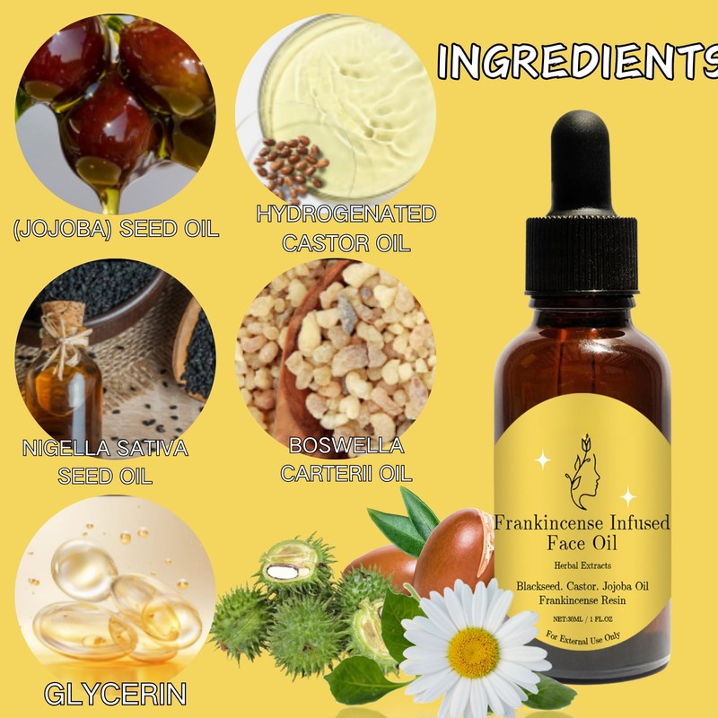 Frankincense oil combination of jojoba seed oil and black seed oil has a light texture and is quickly absorbed without leaving a greasy feeling