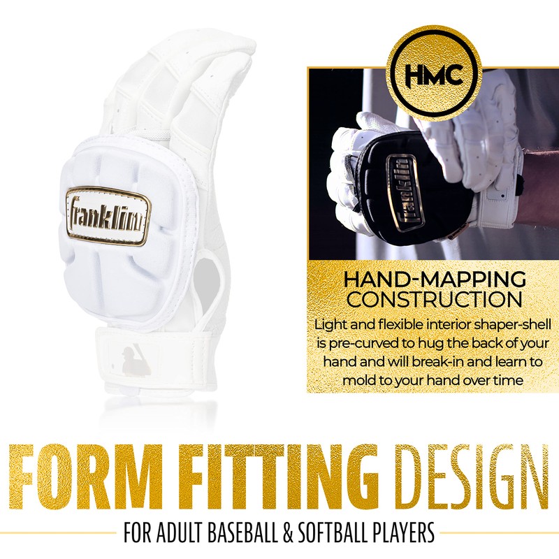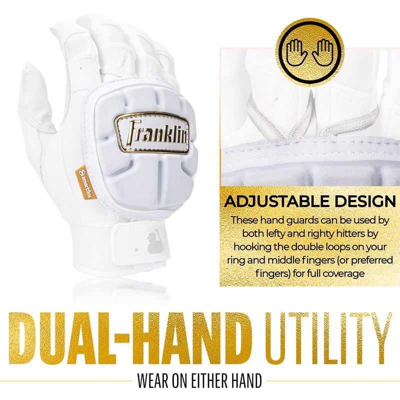 Franklin Sports Baseball Hand Guard - PRT LT Series Adult Hand Protector for Batting - Protective Hand Shield for Right + Left Hand Hitters - White + Gold - Adjustable One-Size - Adult