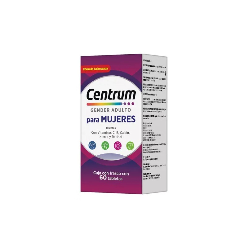Frasco Multivitamínico Centrum Mujer con Vitamina C Vitamina E Calcio Hierro y Retinol 60 Tabletas Sin sabor