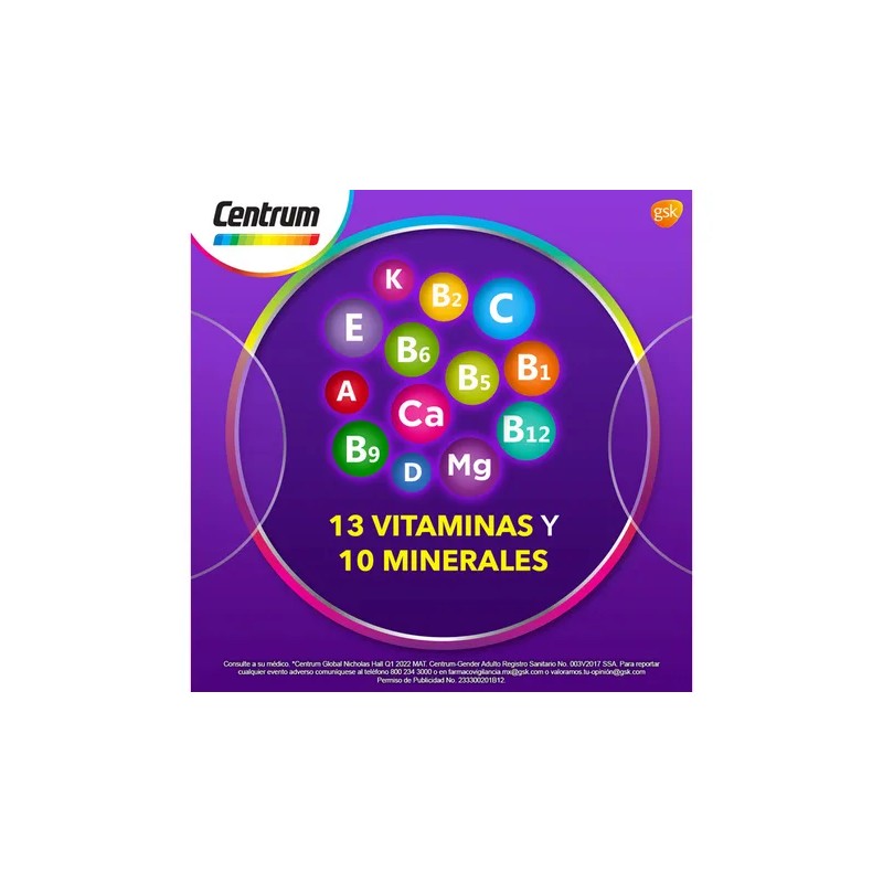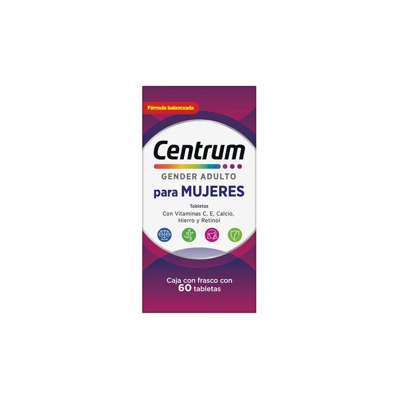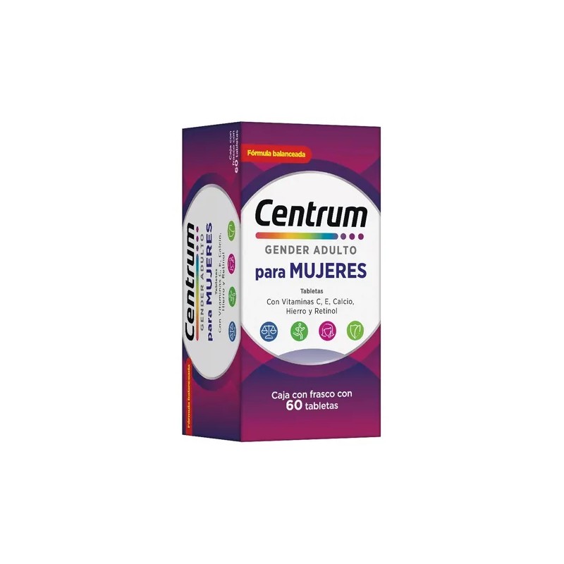 Frasco Multivitamínico Centrum Mujer con Vitamina C Vitamina E Calcio Hierro y Retinol 60 Tabletas Sin sabor
