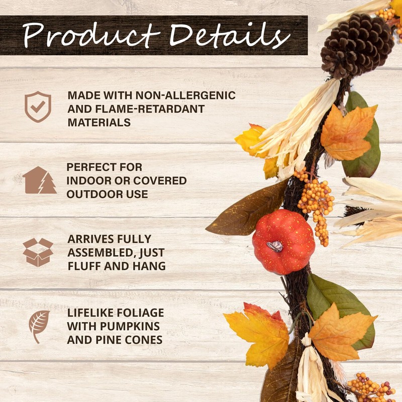 - Designer Finishes: Handcrafted spiral vine garland trimmed with life-like artificial pumpkins, pinecones, cornhusks, wheat, and greenery; suitable for indoor or covered outdoor use