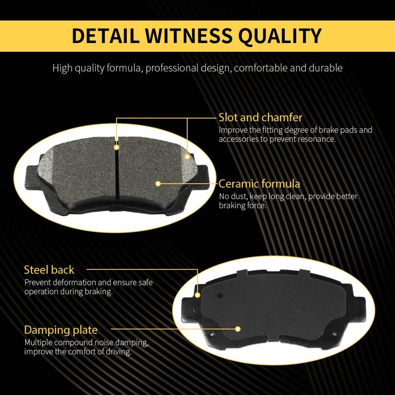 - High performance ceramic:These brake pads are made of premium ceramic material, superior friction resistance, extreme heat tolerance, low dust, and quiet operation for a clean, smooth braking experience.