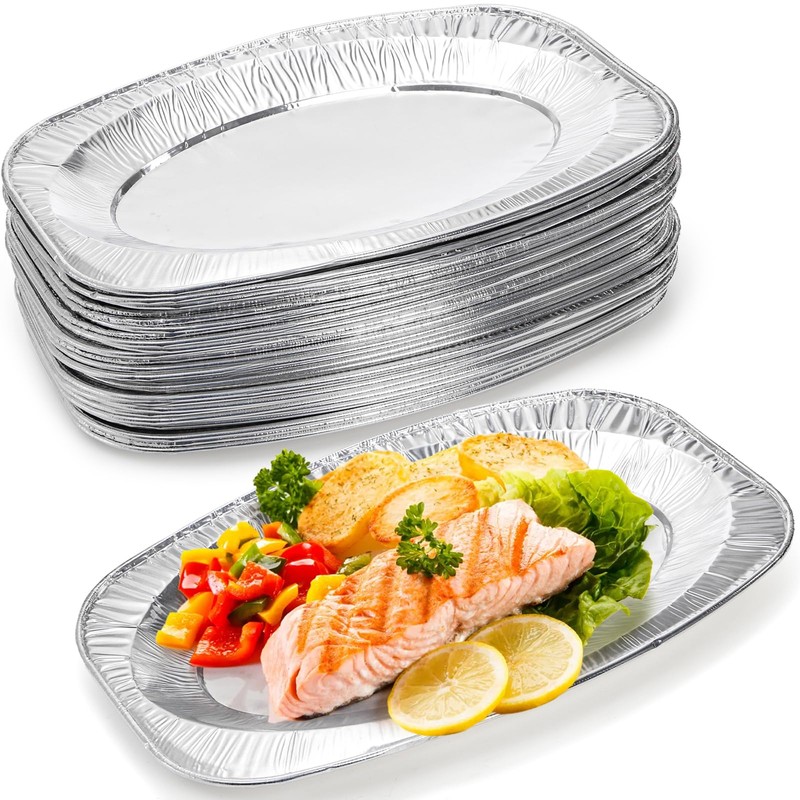 - Disposable Aluminum Foil Platters: The package includes 30 pack disposable aluminum serving trays. Each tray measures approximately 14"L x 9"W. Set of 30 will effectively meet your requirements