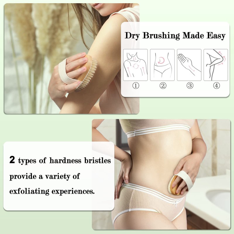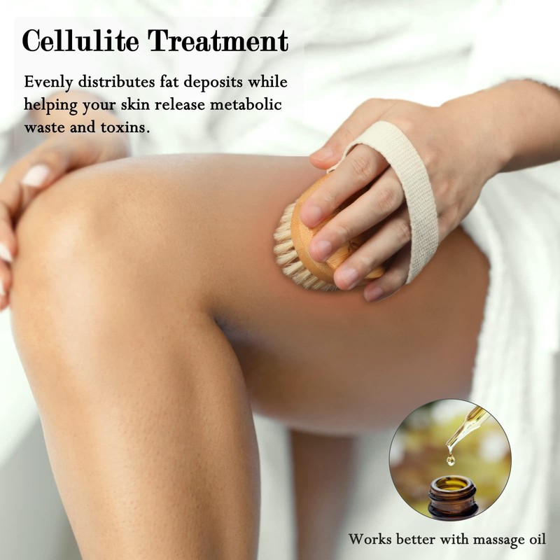 - Dry brush body brush: stiff natural bristles easily remove dead skin and cellulite to soften the skin, promote blood circulation and lymphatic drainage, flawless skin with regular use. Apply cream or oil if the skin is extremely dry or sensitive to avoid damage. Allow to air dry after getting wet.
