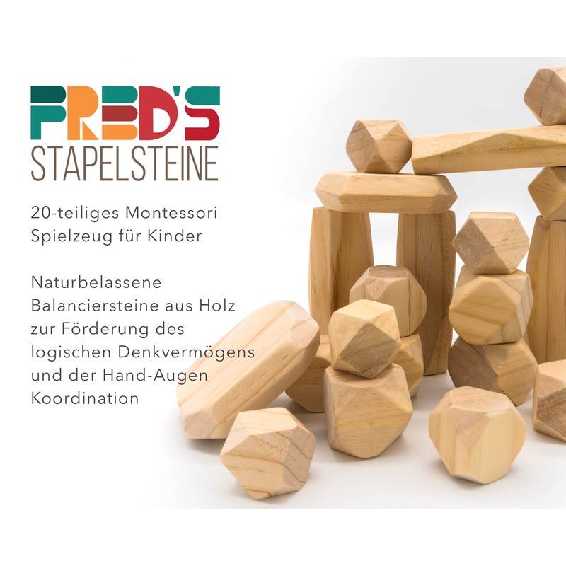 - 🎁【Ideal gift】: 20 pieces children's wooden blocks toy with a carry bag. Fred's stacking stones make a great birthday or Christmas gift for children. Fred's stacking stones and the entire packaging are plastic-free and 100% recyclable. The wooden stones are easy to clean at any time with a damp cloth.