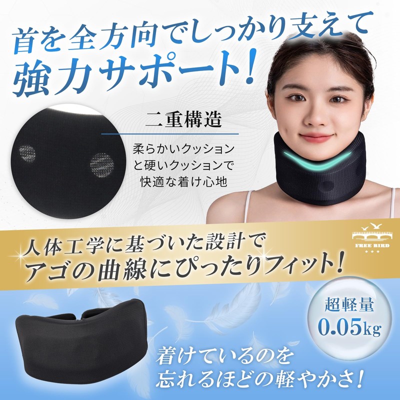 - ✅【着けているのを忘れるほどの快適さ!】FREE BIRDの首コルセットは、柔らかいクッションと固いクッションの二重構造でできているため、しっかり首を固定しながら、着け心地も快適です。わずか0.05kgと超軽量であり、まるで着けているのを忘れるほどの軽やかさを実現しました。