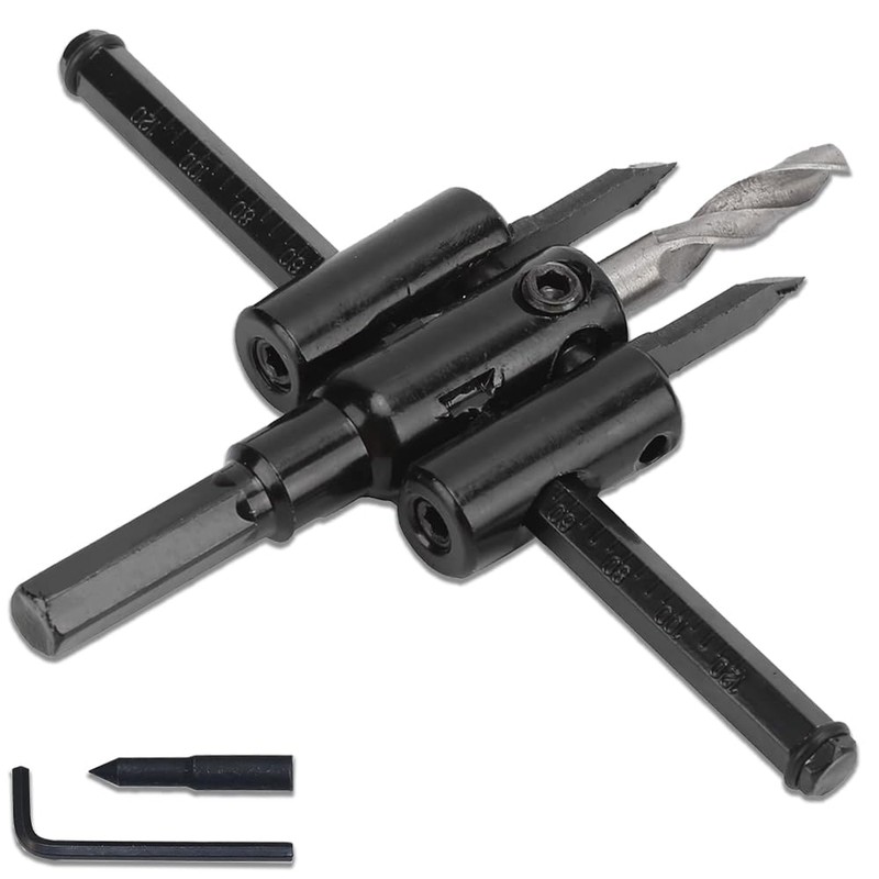 - Hole size, adjustable The distance from cutter head to center can be adjusted by loosening the screws. Applicable materials: solid wood, density board, composite board, plastic. Can be cut to approximately 1.1 inches (27 mm). Prohibited Area: Metal, Slate, Tile, Glass Note: Before using, make sure all the screws of the product are fixed first, do the idle test with hand drilling, make sure the blade is fixed before drilling the hole