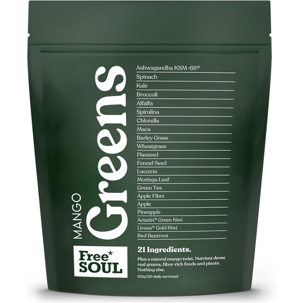 Free Soul Greens | 21 Advanced Greens, Superfoods, and Adaptogens Including KSM-66 Ashwagandha, Vegan & Gluten-Free, Advanced Natural Formula | UK Made | 30 Servings | Mango Flavour