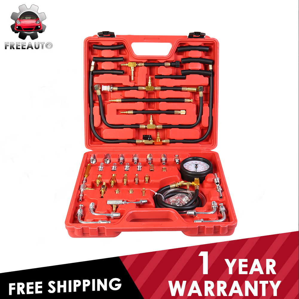 This gasoline fuel injection test set is used to test gasoline fuel pump pressure on most fuel injection equipped vehicles.It Designed with a relief valve and 6 feet of tubing to relieve the pressure and fuel safely. Allow checking for sufficient fuel flow. The fuel pressure gauge kit equipped with pressure release valve makes it safe and fast to use. Whole kit packed in a molded case making it easy to store and organize the equipment.