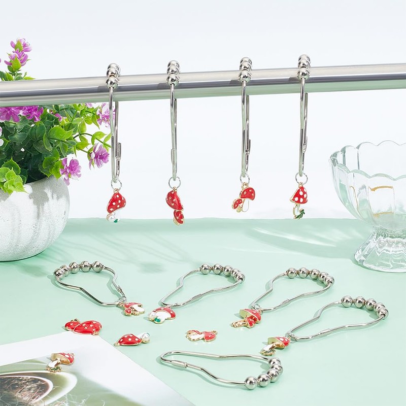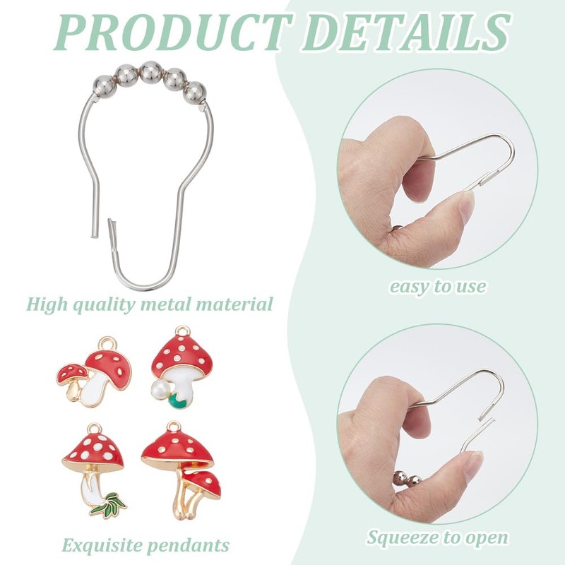 FREEBLOSS 12Pcs Shower Curtain Hooks Rings with Mushrooom Pendant Rust Proof Stainless Steel Bathroom Curtain Hooks for Shower Rods