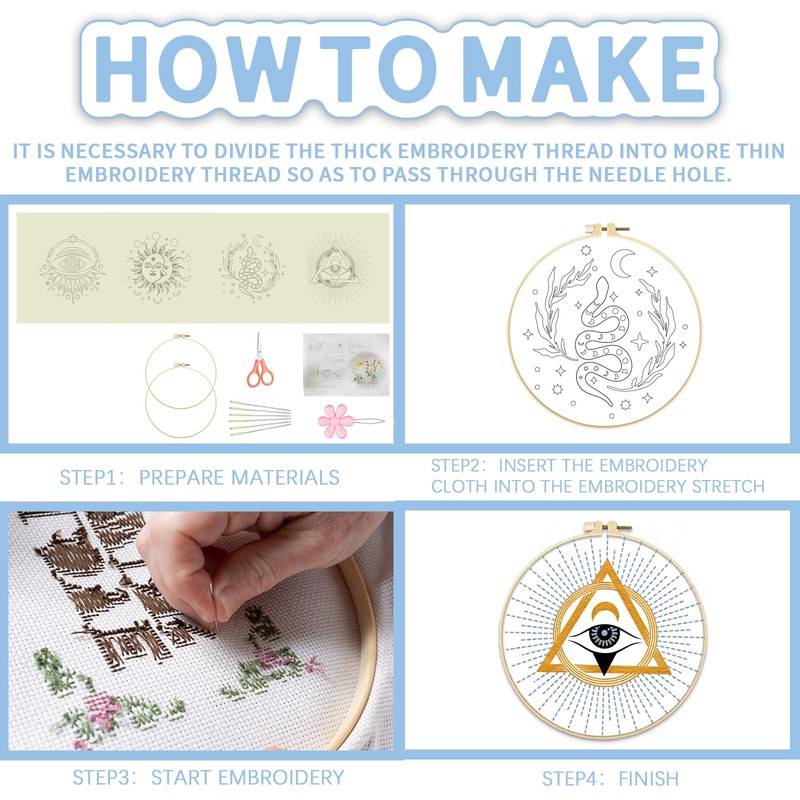 • Delicate Patterns: If you are very interested in embroidery, why not try to practice more with our embroidery kits? We provide divination and moon phase patterns with colorful flosses, enough to give you a sense of accomplishment from embroidery.