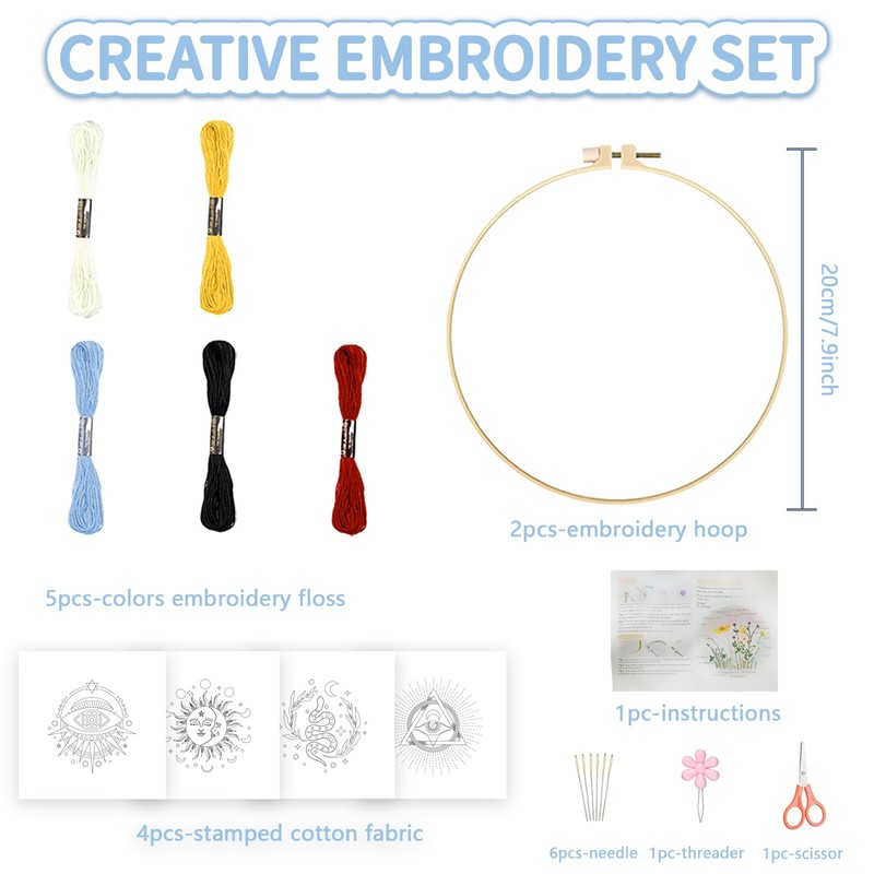 • Embroidery Starter Kit: Package includes 4 embroidery cotton cloth with delicate divination patterns, 2 plastic adjustable embroidery hoops, 5 colors embroidery floss, 6pcs needles and other tools you will need.