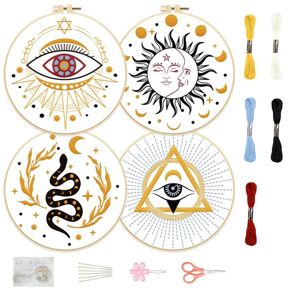 FREEBLOSS 4 Set 8'' Embroidery Kit for Beginners Divination Pattern Embroidery Kit with Instructions Full Kit of Embroidery Cloth 2 Embroidery Hoops 5 Colors Flosses