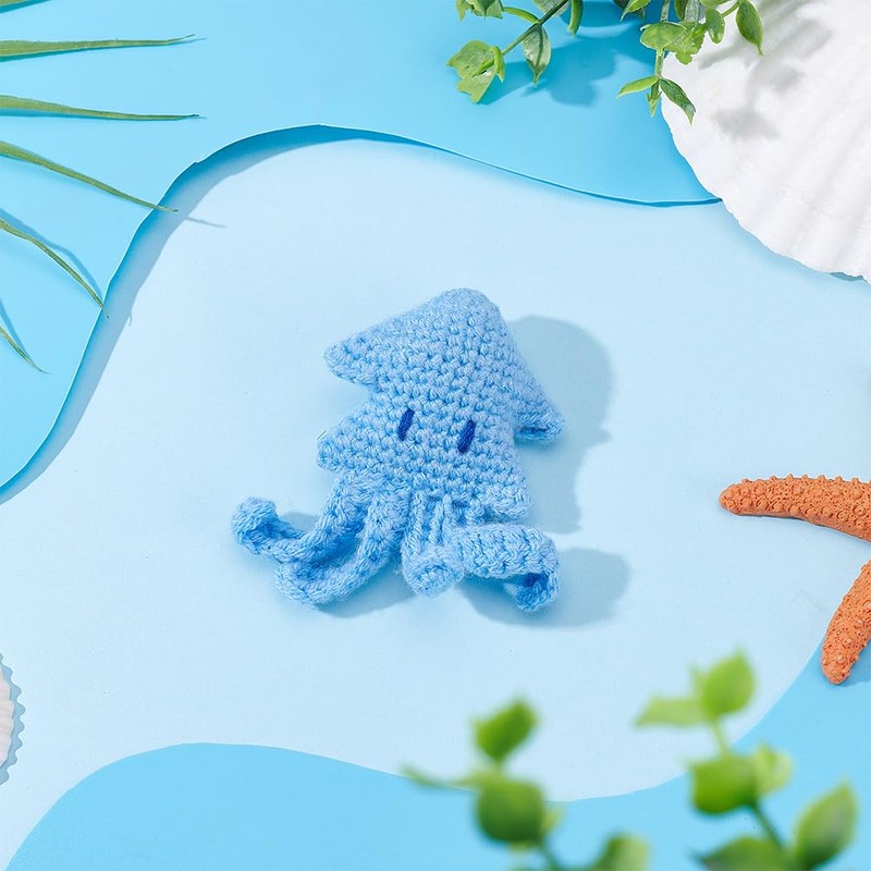 - Crochet Squid Keychain: The kit contains 3 crochet hooks, 1 packet of filler cotton, 5 knitting markers, 4 spools of yarn, 2 colors of embroidery flosses, and other required accessories.