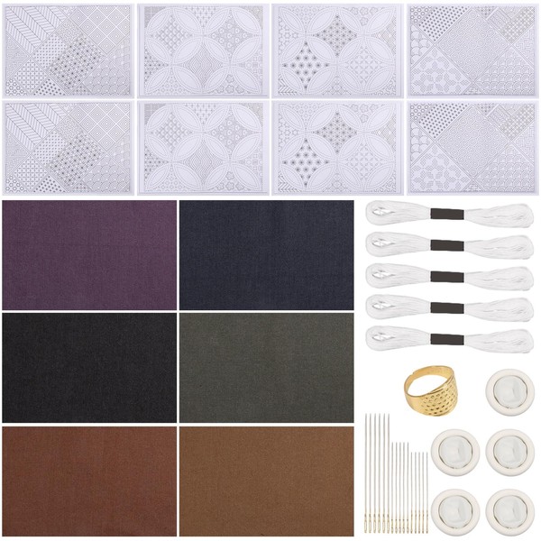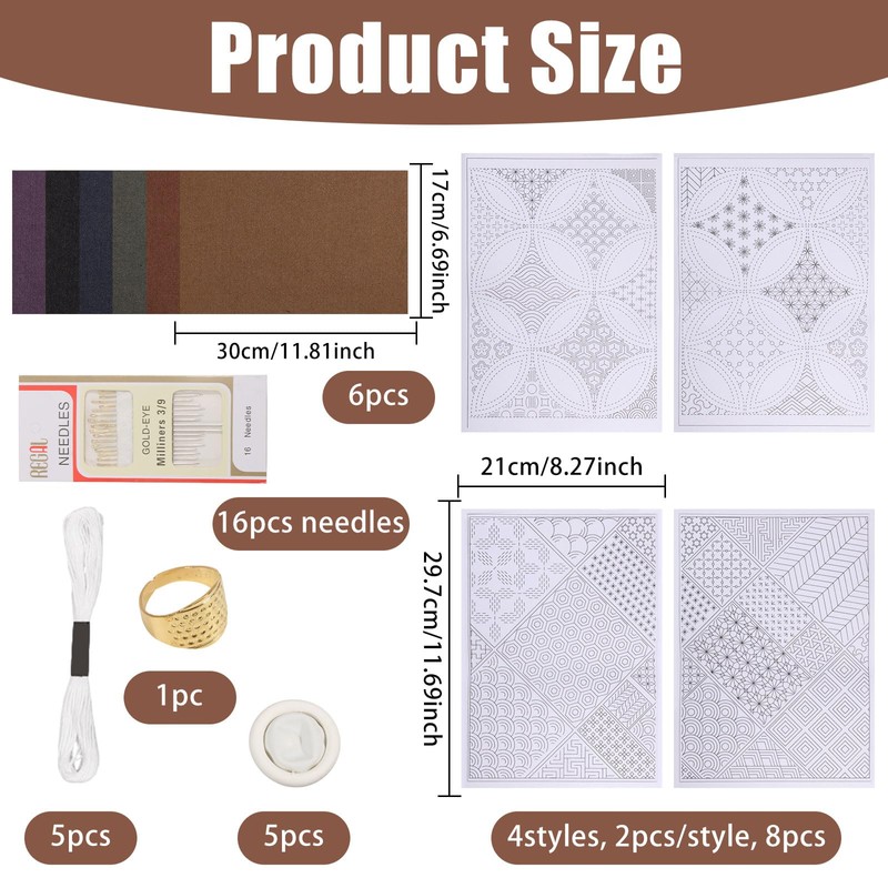 - Complete Sashiko Starter Kit: Includes 6pcs pre-cut denim (20x25cm), 8 water-soluble templates (including 4 different patterns), 16 needles, thimble, 5 white threads, and 5 rubber finger guards—all essentials in one pack