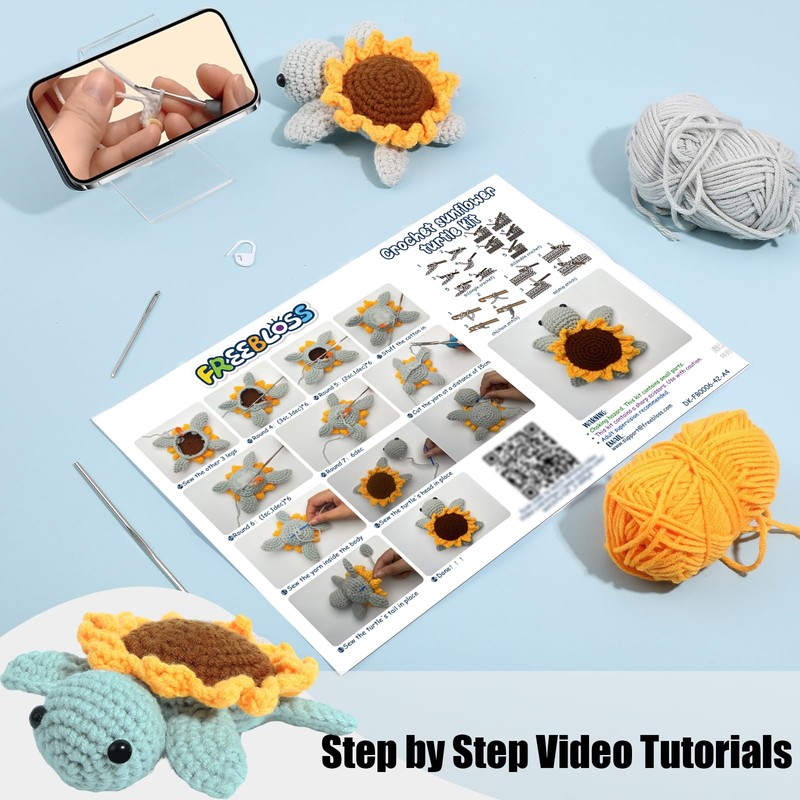 FREEBLOSS Set of 4 Crochet Set, Adorable Sunflower Turtle Crochet Yarn and Crochet Hook Set, Crochet Starter Set with Instructions Crochet Animal Set, Crafts for Adults, Beginners, Craft Enthusiasts