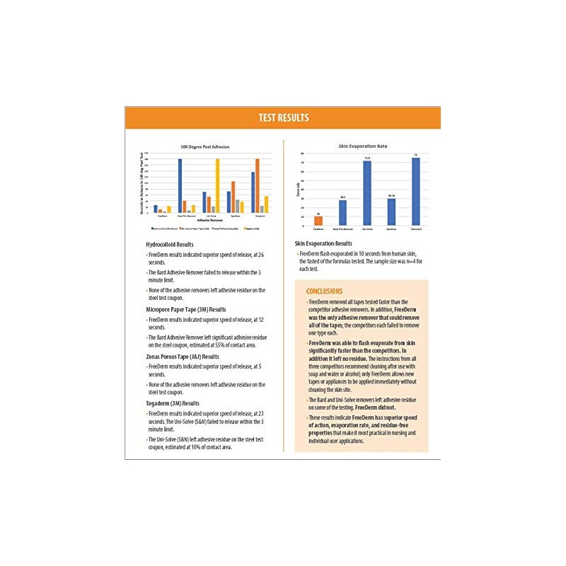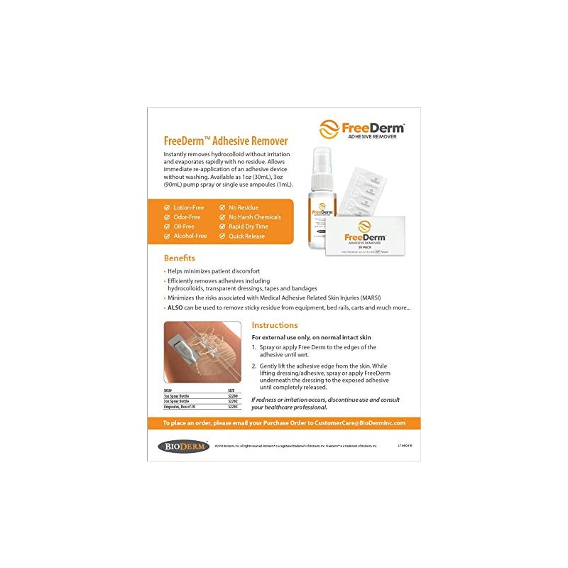 FreeDerm Adhesive Remover instantly removes hydrocolloid without irritation and evaporates rapidly with no reside. Allows immediate re-application of an adhesive device without washing.