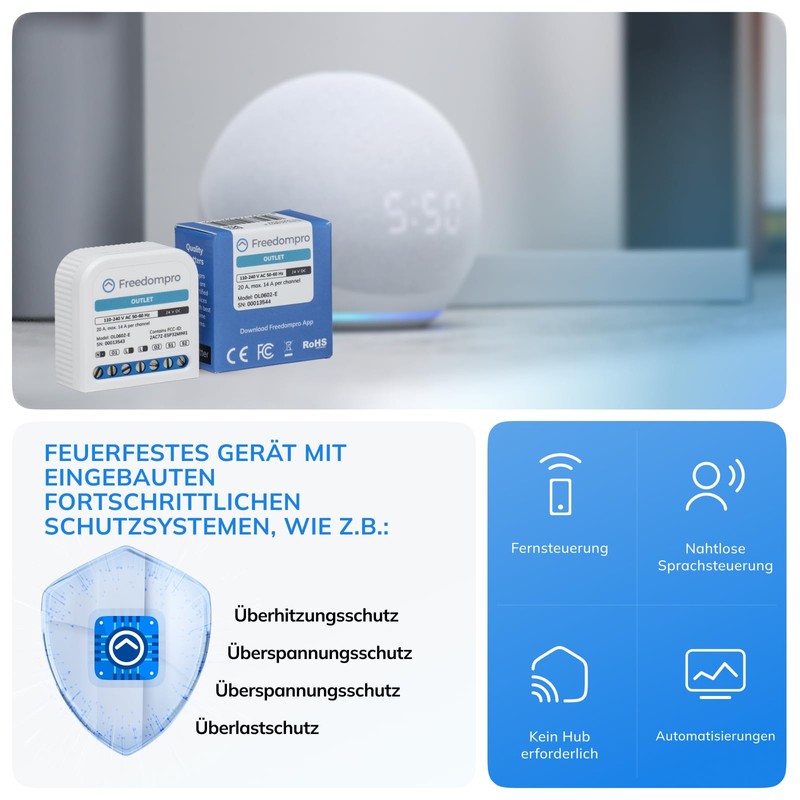 Freedompro Steckdosenmodul Mini OL0602-E, Smart WiFi 2-Kanal Schalter, Hausautomatisierung, Kompatibel mit Apple HomeKit, Alexa, Google Home, Matter, Hubless, 110-230V, für Unterputz-/Außensteckdose