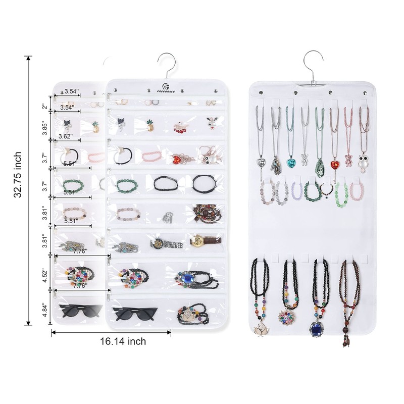 • QUALITY MATERIALS: Freegrace’s sturdy hanging jewelry organizer is made of 600D polyester Oxford fabric and has a PU backing (SIZE: 32.7’’ x 16.5’’). The pockets are made of transparent PVC to allow you to see through to the stored jewelry, and the zipper and revolving metal hanger are durable.