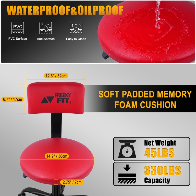 FreekyFit Rolling Shop Stool with Wheels, Mechanic Garage Stool Chair with Adjustable Height 15.55"-18.3", Heavy Duty Swivel Roller Seat for Garage, Salon and Tattoo Beauty, Red