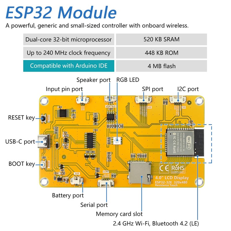 - Onboard ESP32 Module: Dual-core 32-bit microprocessor up to 240 MHz, 4 MB flash, 520 KB SRAM, 448 KB ROM, 2.4 GHz Wi-Fi and Bluetooth 4.2 (LE)