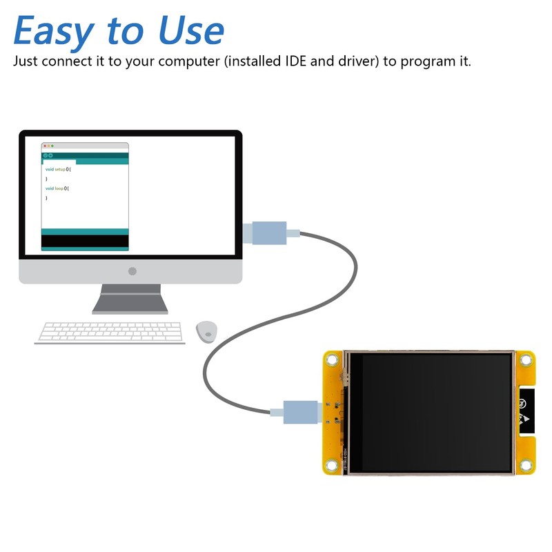 Important Notes:Resistive touch screens require a certain amount of pressure to recognize touch inputs.Fingers may not be recognized well, please use your nails or the stylus provided.Overview:This is a touchscreen monitor with onboard dual-core 32-bit 240 MHz ESP32 module.Just connect the board to your computer (installed IDE and driver) with the USB cable to program it.We provide free technical support to help you with any questions and problems.Tutorial:Comes with detailed tutorial and code. (Download needed, no paper tutorial.)Including several typical projects for ESP32 and LVGL GUI library.The download link can be found on the product box.Contents of Tutorial:PrefaceChapter 1 SerialChapter 2 RGBChapter 3 ButtonChapter 4 Button InterruptChapter 5 VoltageChapter 6 Memory CardChapter 7 Play MusicChapter 8 BLEChapter 9 WIFI Web ServerChapter 10 TFT ScreenChapter 11 TFT Touch CalibrateChapter 12 TFT Touch DrawChapter 13 LVGLChapter 14 LVGL PictureChapter 15 LVGL TimerChapter 16 LVGL RGBChapter 17 LVGL MusicChapter 18 LVGL MultifunctionalityChapter 19 LVGL DemoWhat's Next?Package Includes:1 x Touchscreen monitor1 x Stylus1 x USB A to C cable2 x Connecting cable (4P)1 x Connecting cable (2P)