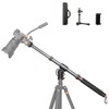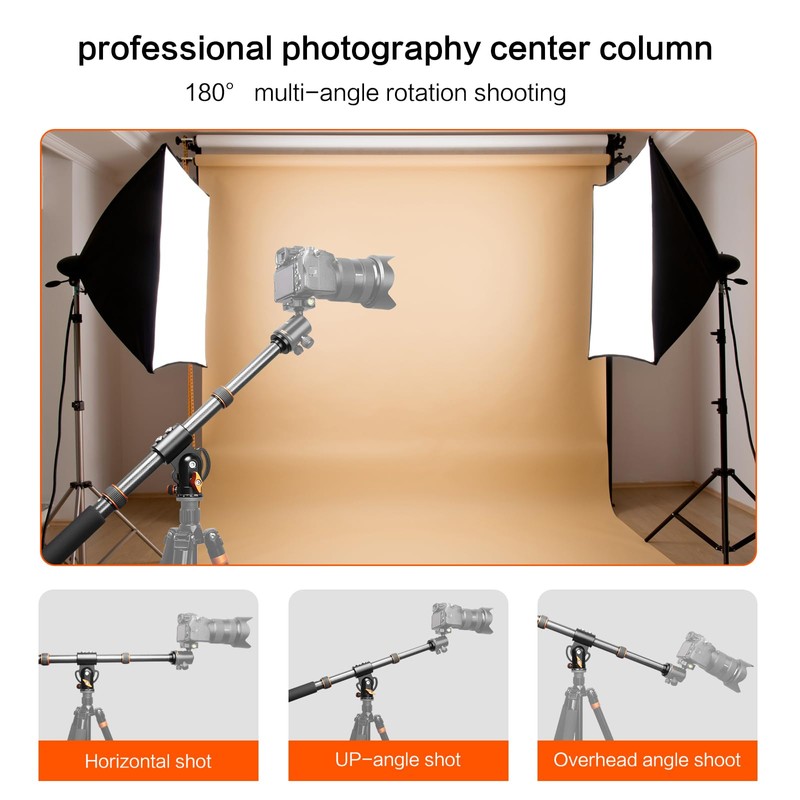 - 【PROFESSIONAL】Standard1/4 and 3/8 inch screws, it is compatible with most ball heads, cameras or camcorders. And this extension arm can be mounted to all tripods. The center column can adjust 360 degree horizontal scale rotation and 180 degree vertical multi-angle function during shooting. Two sections of retractable tube, a total length of 104CM/41''. A counterweight hanging ring at the tail can be used to hang a storage bag with a heavy weight for increased stability.
