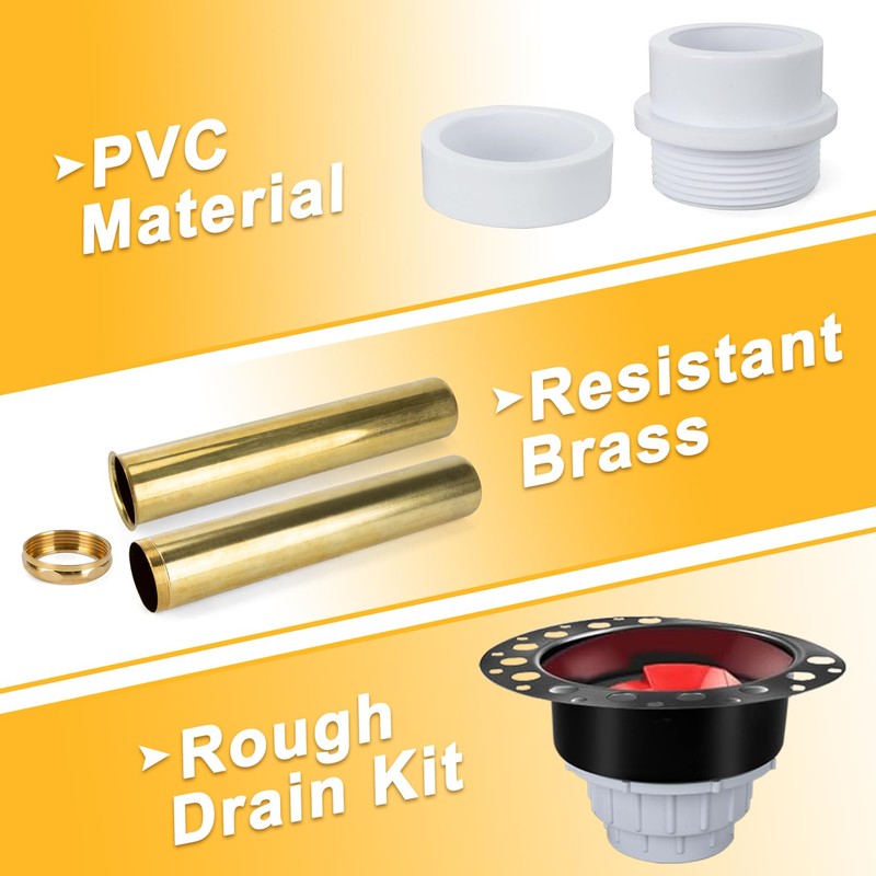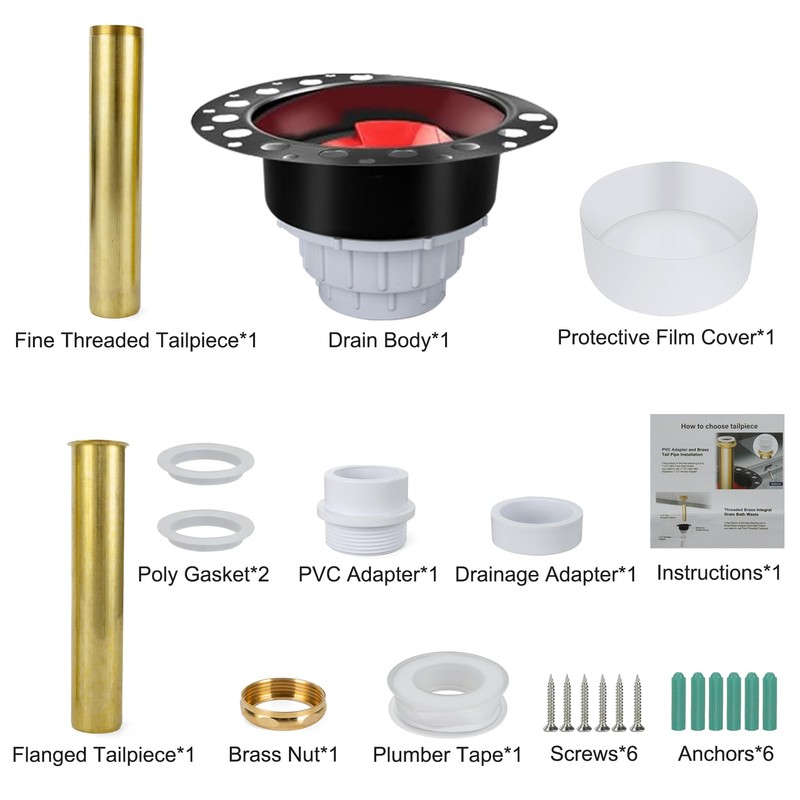 - 【Package】Drain Body*1, Fine Threaded Tailpiece*1, Flanged Tailpiece*1,PVC Adapter*1, Drainage Adapter*1, Brass Nut*1, Poly Gasket*2, Protective Film Cover*1, Screws*6, Anchors*6 and Instructions*1.