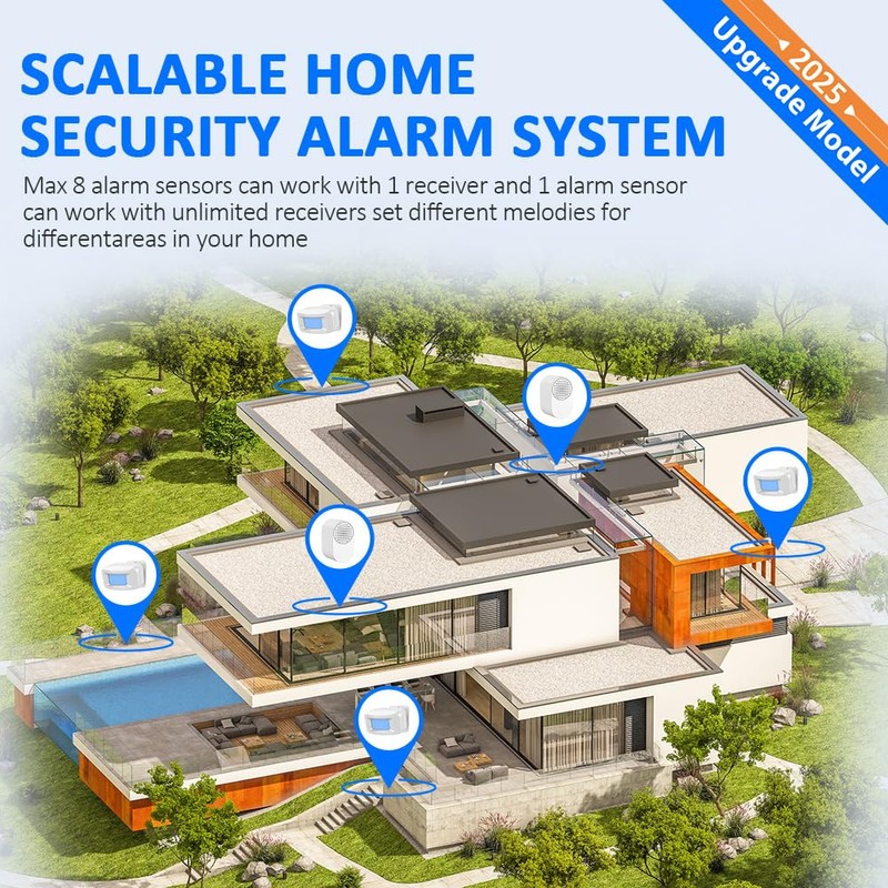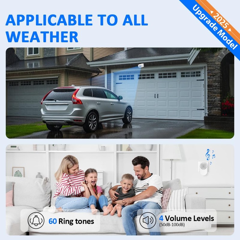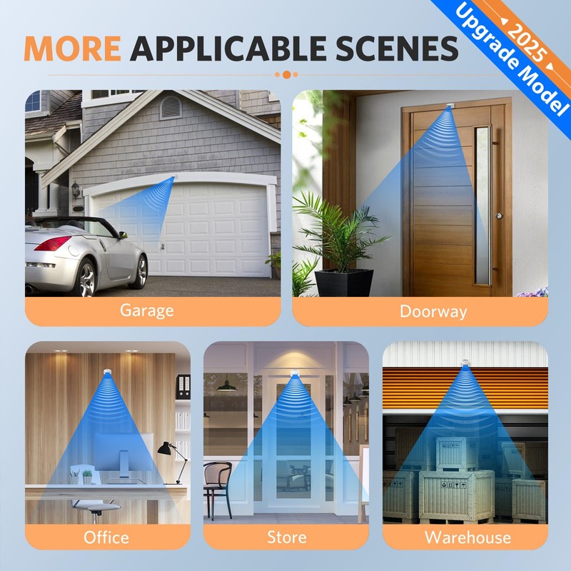 - WIDE RANGE APPLICATIONS SCENES - This is the newest model, driveway alarms are essential in home, outdoor motion detectors security systems. It's designed to detect people,vehicles,or animals entering in perimeter areas (driveway, front porch,backyard, gate, home, garage, office, mailbox,etc.) and activates motion sensor alarm alerts to the connected receiver.It alerts homeowners of unexpected intruders or visitors, keeping your property and loved ones more secure