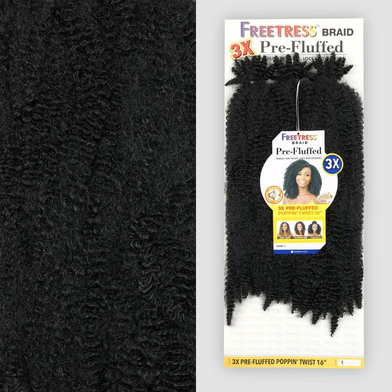 **FreeTress Crochet Braids 3X Pre-Fluffed Poppin Twist 16"** **\- 30 Strands(3x)** **Color Shown: 1B, T27** **Colors: 1, 1B, 2, 27, 30, 4, GREY, T27, T30, T530** **"Colors of image and actual product may slightly vary based on screen resolution."** Freetress Pre-fluffed braids create the perfect twists, distressed locs, butterfly locs and crochet looks because of it’s a unique curl that blends incredibly well with natural hair. On top of that, each strand is super soft and easy to separate. HAIR CARE INSTRUCTION SCALP CLEANSING