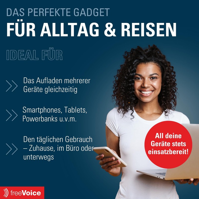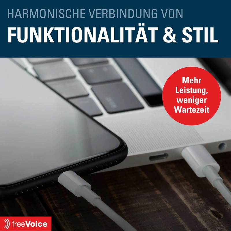 The freeVoice 2-in-1 charging port is the perfect charger for anyone who wants to charge multiple devices at the same time. Equipped with a USB-A and USB-C port, it delivers an impressive total power of up to 65 watts. Thanks to its compact design, the adapter is super space-saving without sacrificing performance and efficiency - ideal for use at the desk, in the office or on the go.