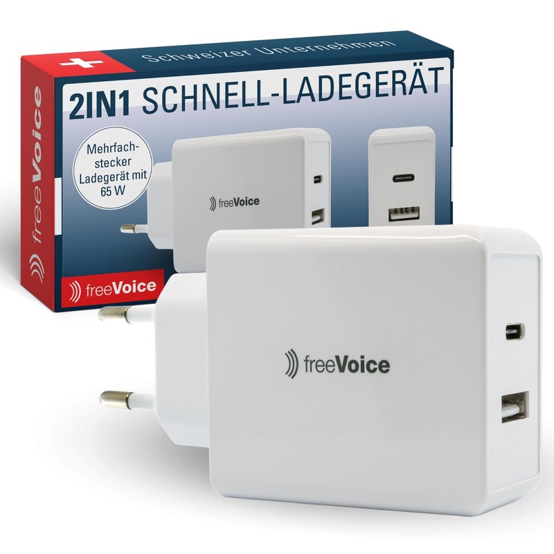 freeVoice Fast Charger 65 W I Multiple Charger with 1 x USB-A & 1 x USB-C Port I Multiple Power Supply for Smartphones, Laptops & Headphones I USB Charger for Simultaneous Charging